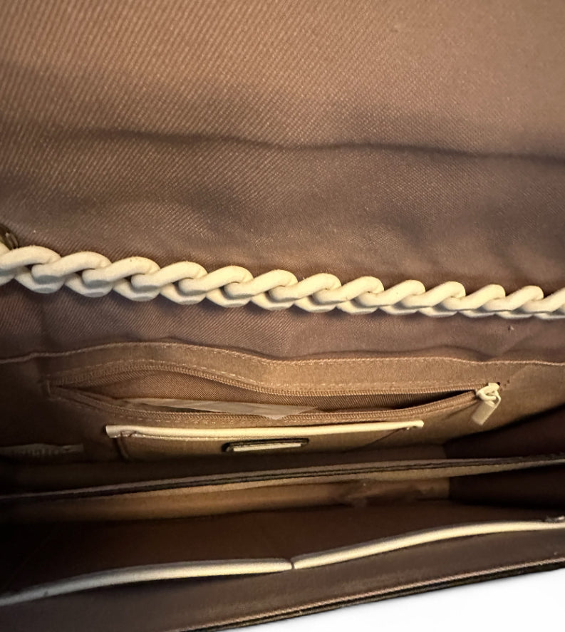 Inside, you’ll find a smooth beige lining with a zip pocket and card compartment for easy organization. The magnetic snap closure keeps your belongings secure, while the polished metal details elevate its luxury feel.