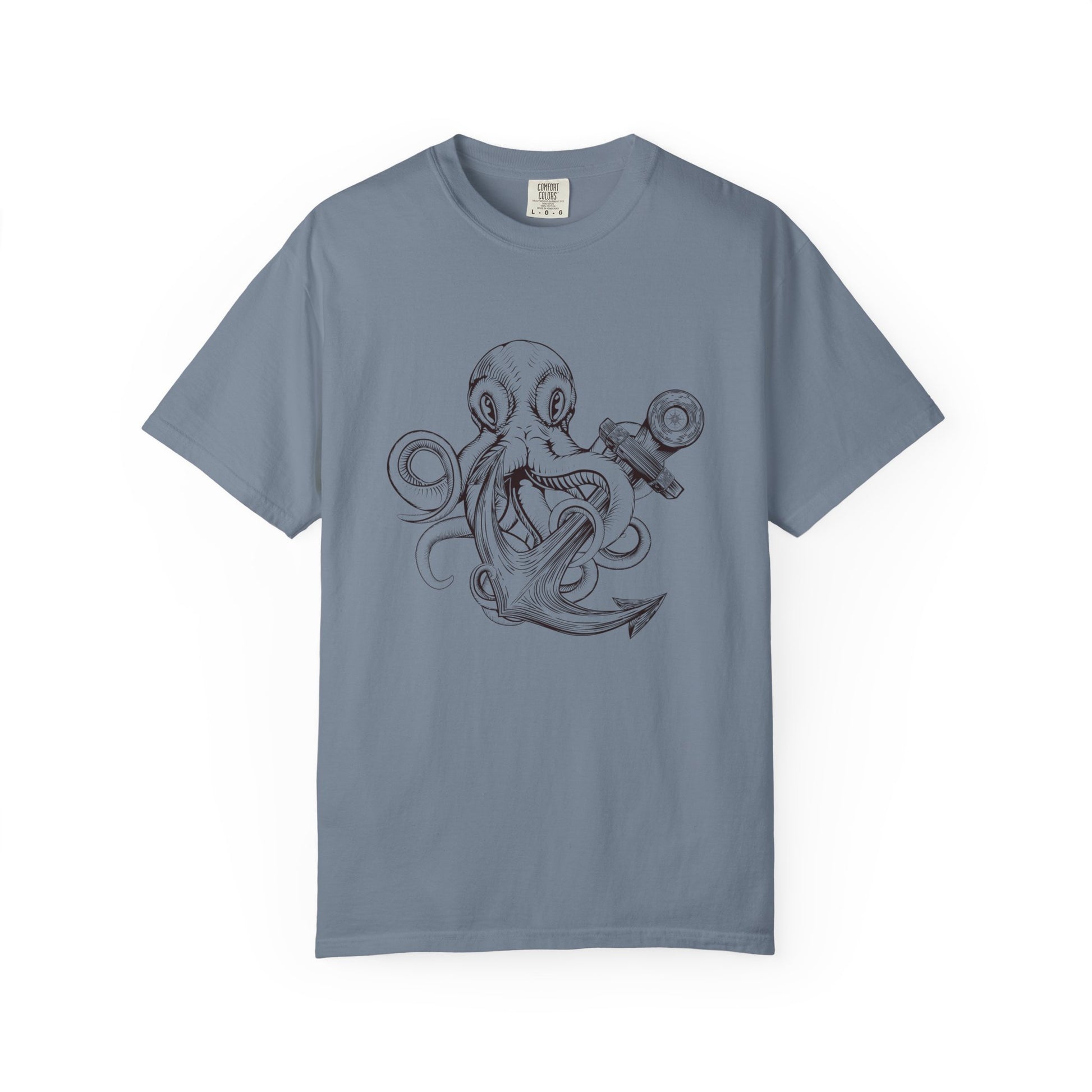A soft, garment-dyed cotton tee that feels broken-in from the first wear and carries a hand-drawn maritime sketch right on the chest. The illustration — an ink-style octopus curled around a ship anchor — breathes with fine linework and subtle shading, giving the shirt a vintage sketchbook look. The heavy-weight 100% ring-spun cotton and relaxed cut make it a durable everyday layer you reach for when you want quiet style and sea-salted character. Wear it on coastal strolls, at the boatyard, or layered under a worn flannel for evenings by the fire.
