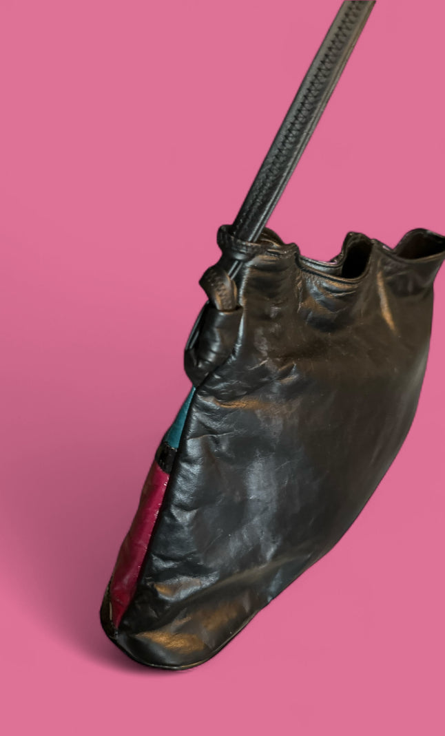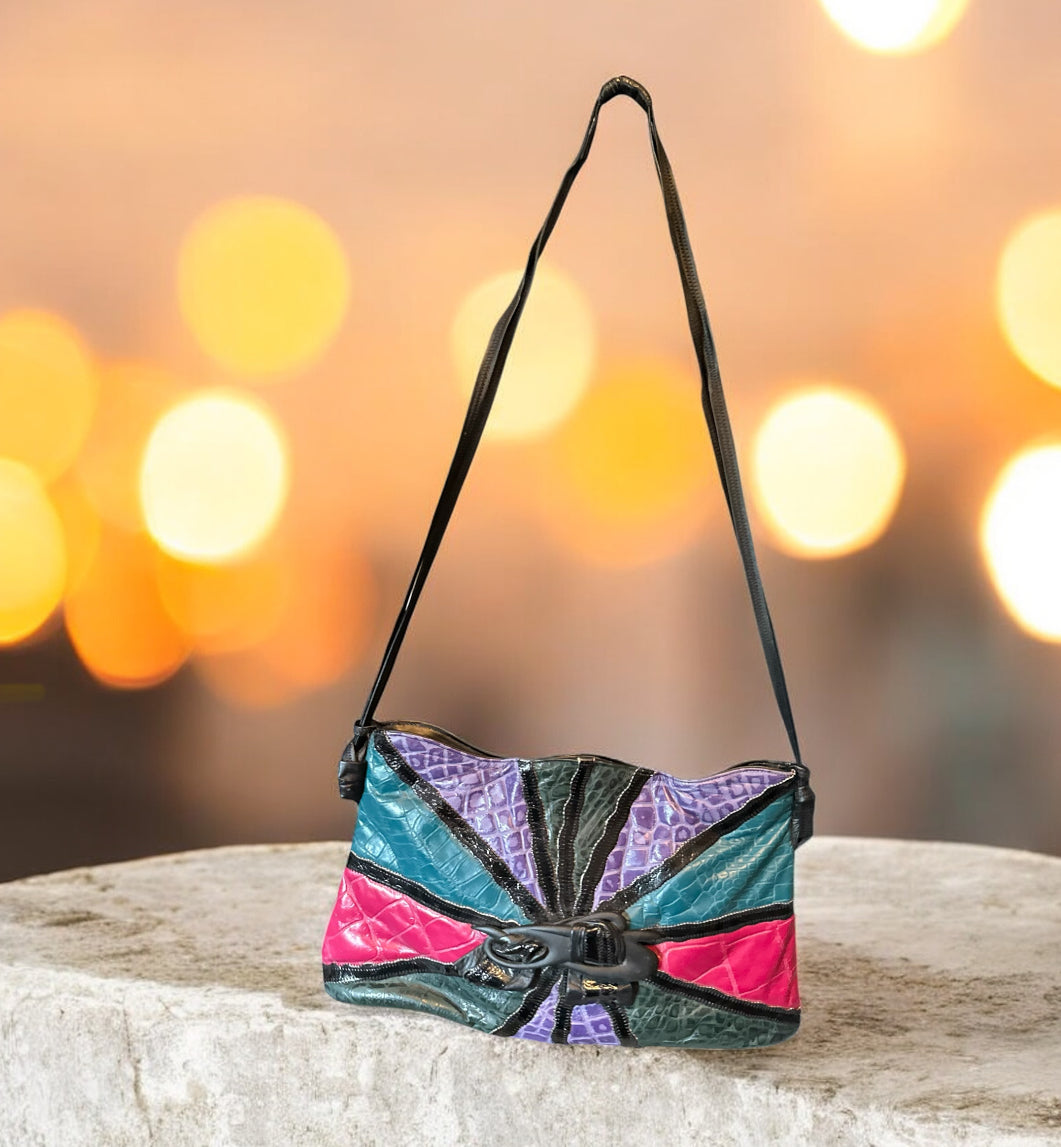 Step into 80s glam with this vintage patchwork faux crocodile purse featuring vibrant jewel tones of teal, magenta, lilac, and black. The front showcases a dynamic sunburst pattern crafted from mixed-texture panels, centered with a statement looped faux leather clasp accent for extra attitude.