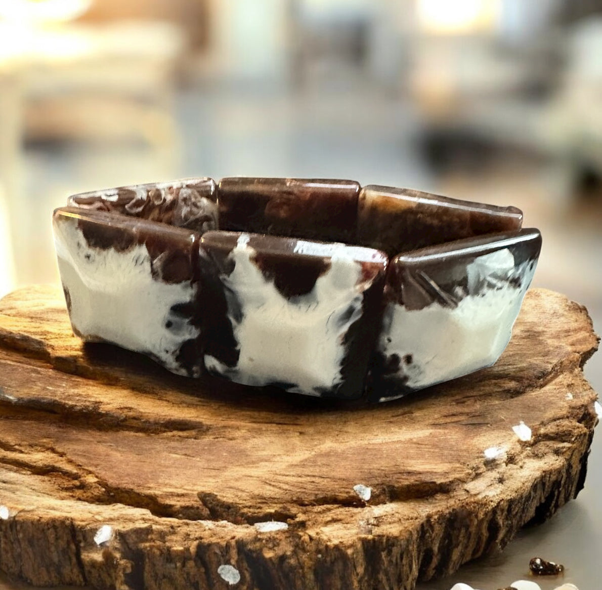 This vintage stretch bracelet is crafted from molded resin designed to imitate natural horn. It features chunky rectangular panels in a striking brown-and-cream marbled pattern, polished to a smooth glossy finish. Lightweight and comfortable, it’s an eye-catching statement piece that pairs well with boho, retro, or Southwestern-inspired looks.