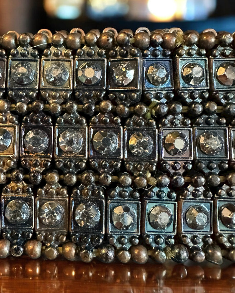Add bold Parisian flair to your collection with this vintage wide rhinestone cuff bracelet, designed in the style of Philippe Audibert’s iconic Roselyne line. The bracelet features three sparkling rows of prong-set rhinestones, framed by beaded silver-tone borders for extra depth and texture. Its wide panel construction makes it a true statement piece, catching light beautifully while showing off its vintage patina.